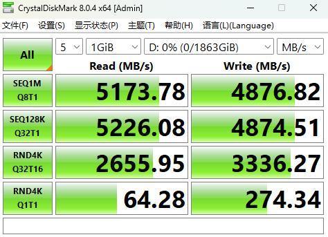经过Crystal DiskMark的测试,我们发现WD Blue SN5000 NVMe SSD 2TB规格的读取速度达5173.78MB/s,持续写入速度也稳定在4876.82MB/s,以官方宣称的读写速度上限为5150MB/s、4850 MB/s来看,这款固态硬盘在实际应用中确实达到了预期标准。
