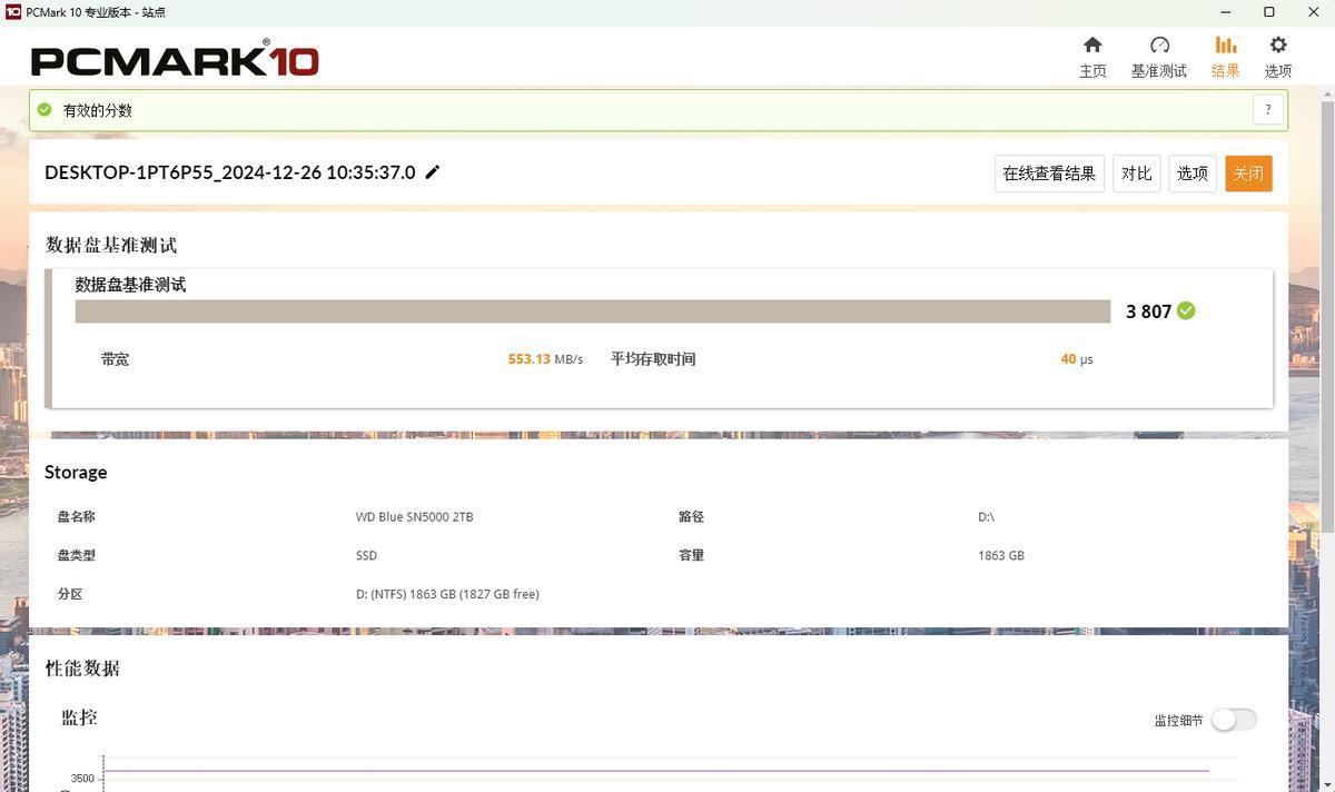 PC Mark的得分为3807分,带宽为553.14MB/s,平均存取时间为40μs,可以充分地证明WD Blue SN5000 NVMe SSD 可以有效地减少处理大型文件、视频渲染剪辑时所需的时间。以一个复杂特效的视频渲染为例,原本在普通硬盘上需要数小时的渲染工作,在WD Blue SN5000的支持下,可缩短至数小时以内,让创作者能够更快地看到渲染结果,及时进行调整和优化,加快项目的整体进度。
