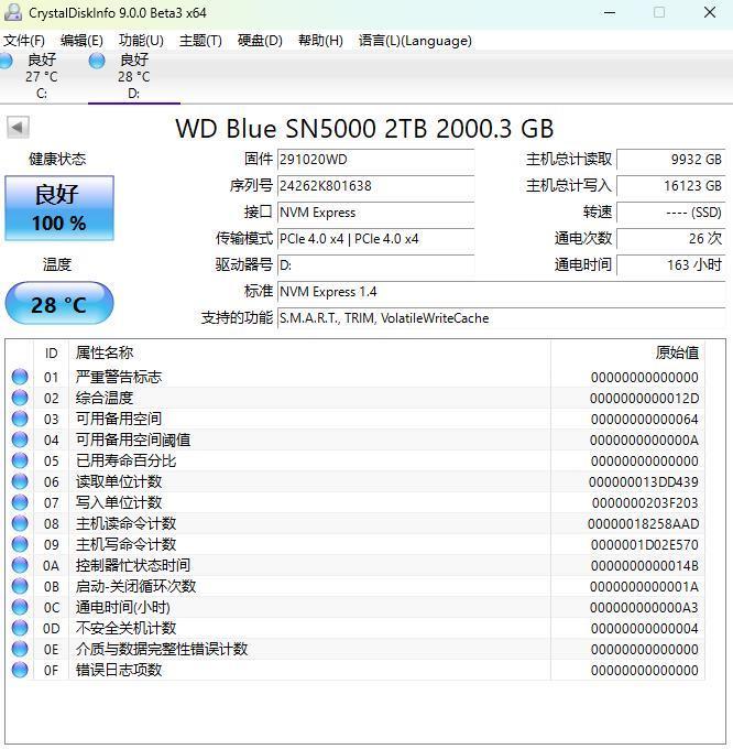 使用CrystalDiskInfo监测,我们发现WD Blue SN5000 NVMe SSD 2TB规格在开机时的温度为28°C。即便进行高强度的性能测试,其温度也仅有轻微上升。结合实际应用表现分析,WD Blue SN5000在严苛的测试环境中,依然表现出了良好的温度控制能力以及强大的负载承受能力。这款固态硬盘能够在持续高速运转的过程中,提供稳定不变的高性能表现。